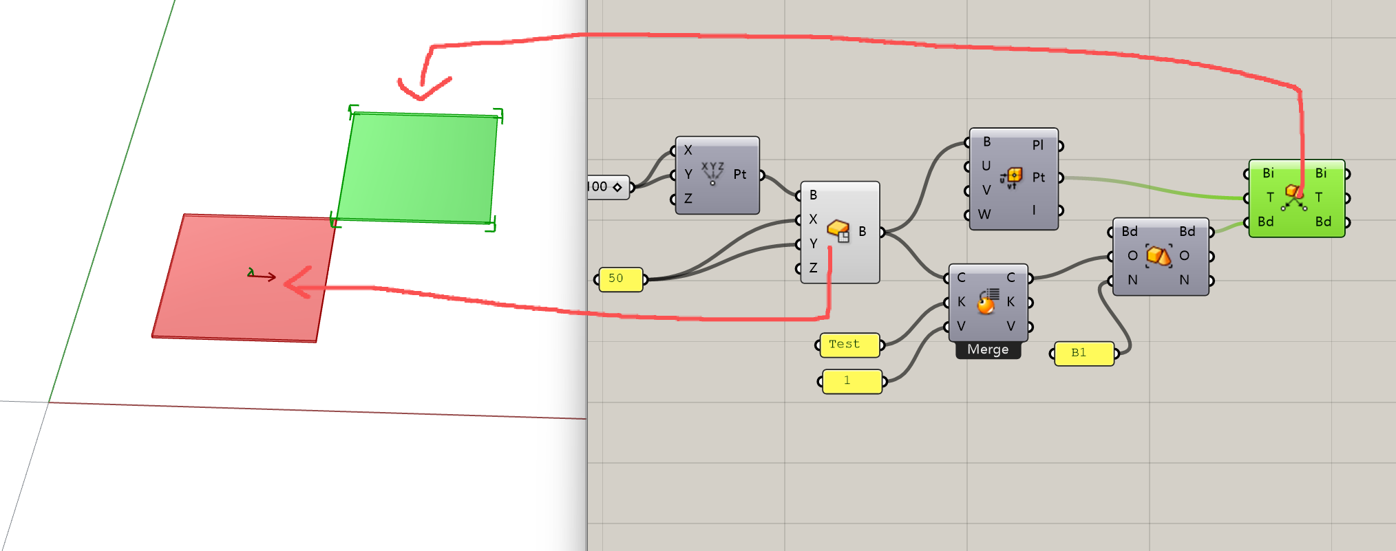 我再GH中创建几何物体,并不在坐标平面000,但是我想根据这个几何物体的中心点B参考作为图块的参考点