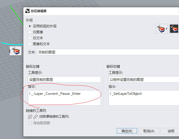 老师 您好 进入列表 选择目前的图层,rhino自带的是 ! _-Layer _Current _Pause _Enter 还要 点 ” 列表(L)“ 后 还是要出现两此对话框 一是 尺寸标注图层,二 是 选取图层 。 这两次对话框最终是一样的吧,没发现有啥区别