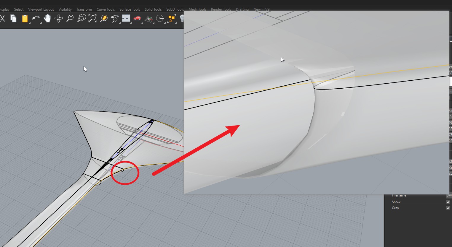 再转换为Nurbs封闭实体的多重曲面后,使用东立面的形状创建了扣减实体,使用布尔扣减运算对这个造型进行了扣减,但是被扣减的地方形状不是太理想的