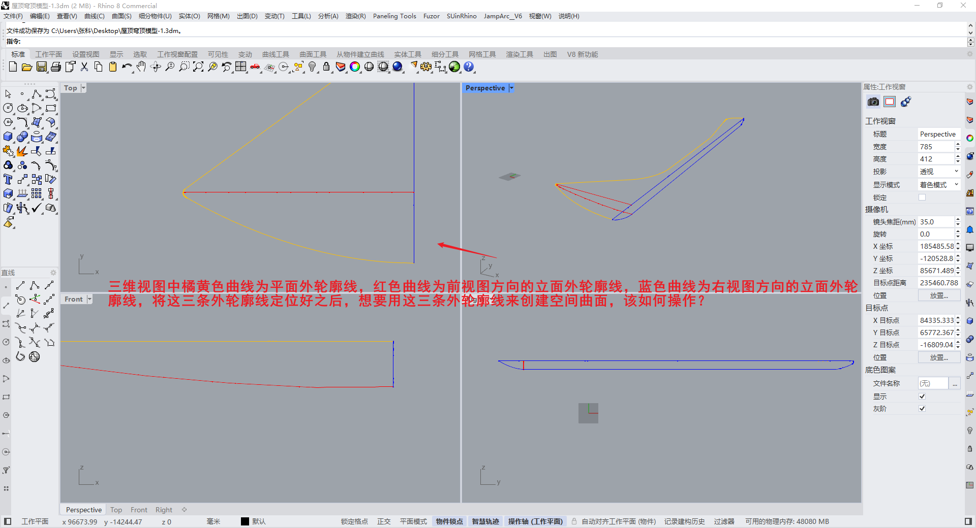 三维视图中橘黄色曲线为平面外轮廓线,红色曲线为前视图方向的立面外轮廓线,蓝色曲线为右视图方向的立面外轮廓线,将这三条外轮廓线定位好之后,想要用这三条外轮廓线来创建空间曲面,该如何操作?