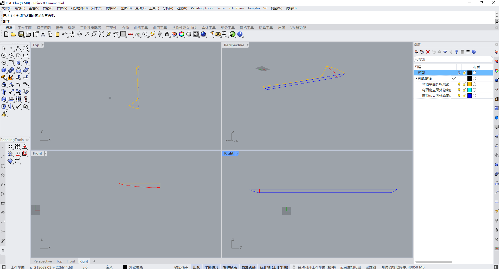 这里根据平面、南立面和东立面三个外轮廓线,创建了一个细分模型,并将它转换为Nurbs曲面