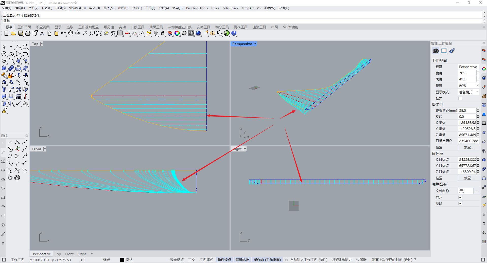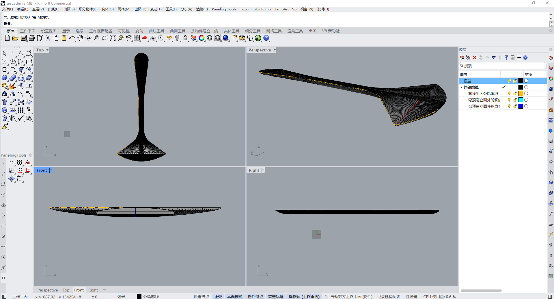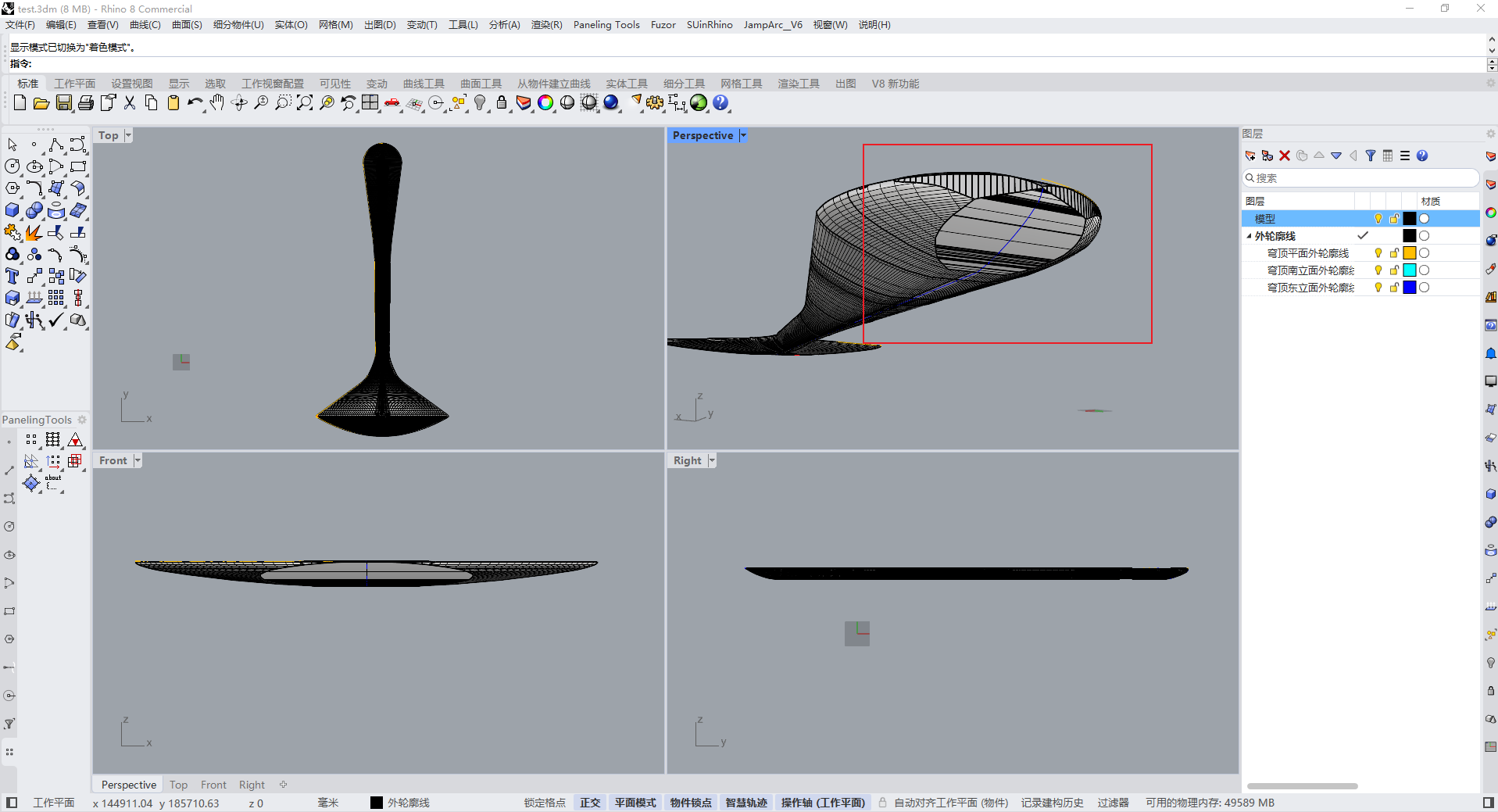 现在我想根据这个创建好的曲面造型,再来重新创建结构合理、布局均匀的新造型,使用了等距断面线来创建Nurbs曲面、网格的方法,已经使用Paneling Tools工具都无法创建出合理的曲面造型。