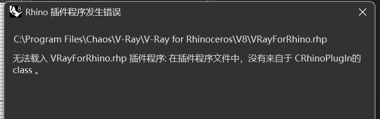 在下载完vray的插件后,打开rhino显示未载入插件,从option工具列插件程序安装rhp文件后,仍无法载入,问题报错为“在插件程序文件中,没有来自于 CRhinoPlugln的class ”